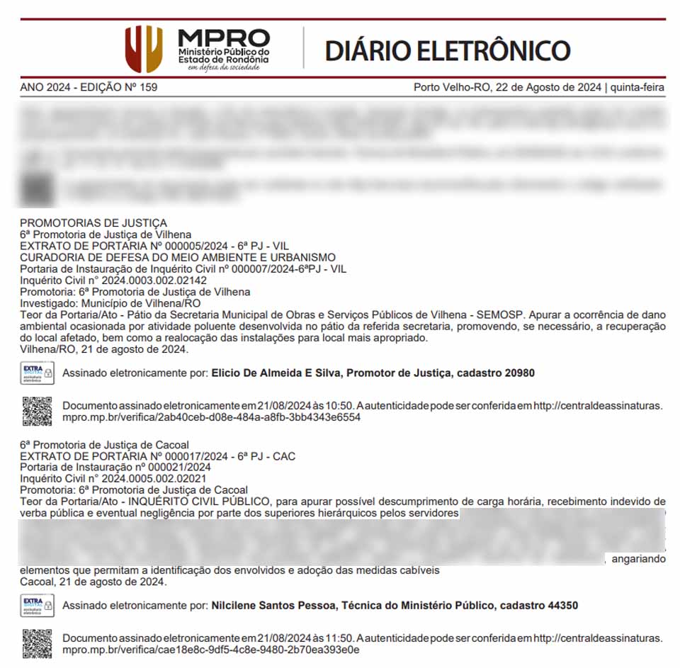 Os documentos foram assinados eletronicamente no sistema do MP/RO, com a eventualidade de serem verificados por meio de links disponibilizados nas respectivas portarias. As investigações seguem em curso, com o objetivo de colher elementos suficientes para a adoção de medidas cabíveis, conforme o que for apurado durante o processo.